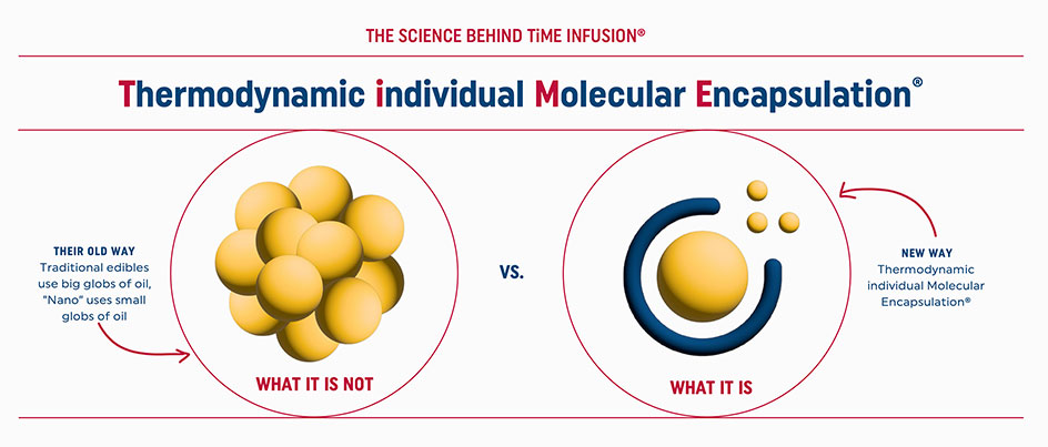 TiME Infusion®, which stands for Thermodynamic Individual Molecular Encapsulation, surrounds each THC molecule with a water-friendly coating. Because your body is mostly water—and THC is naturally fatty—this coating lets your body absorb cannabinoids almost immediately instead of waiting for digestion.